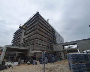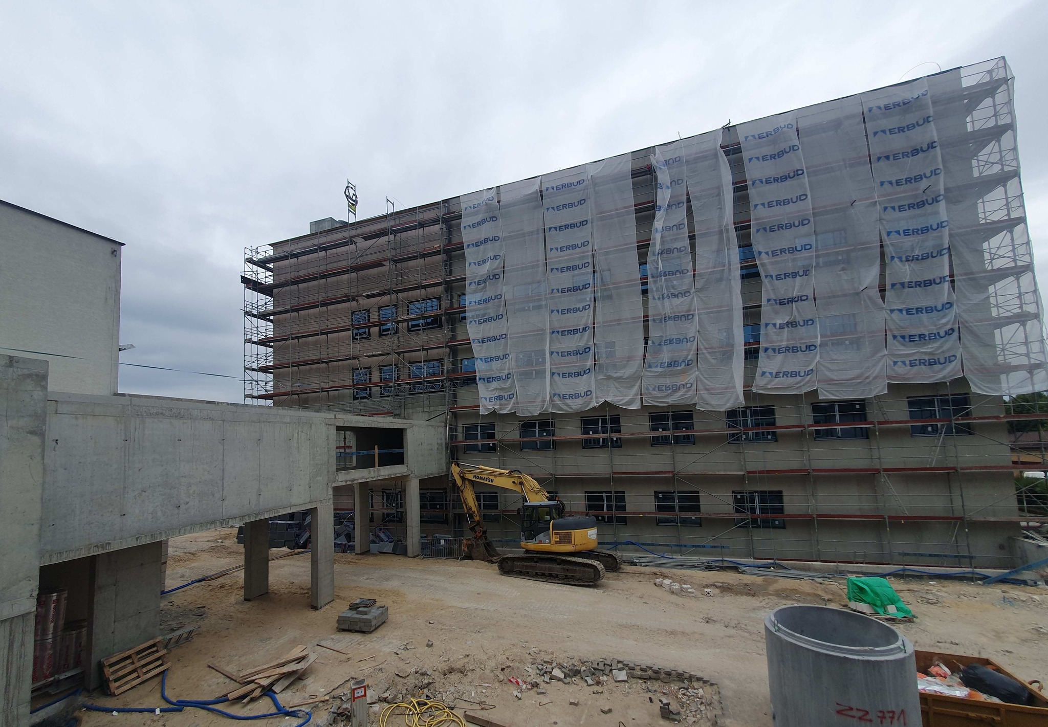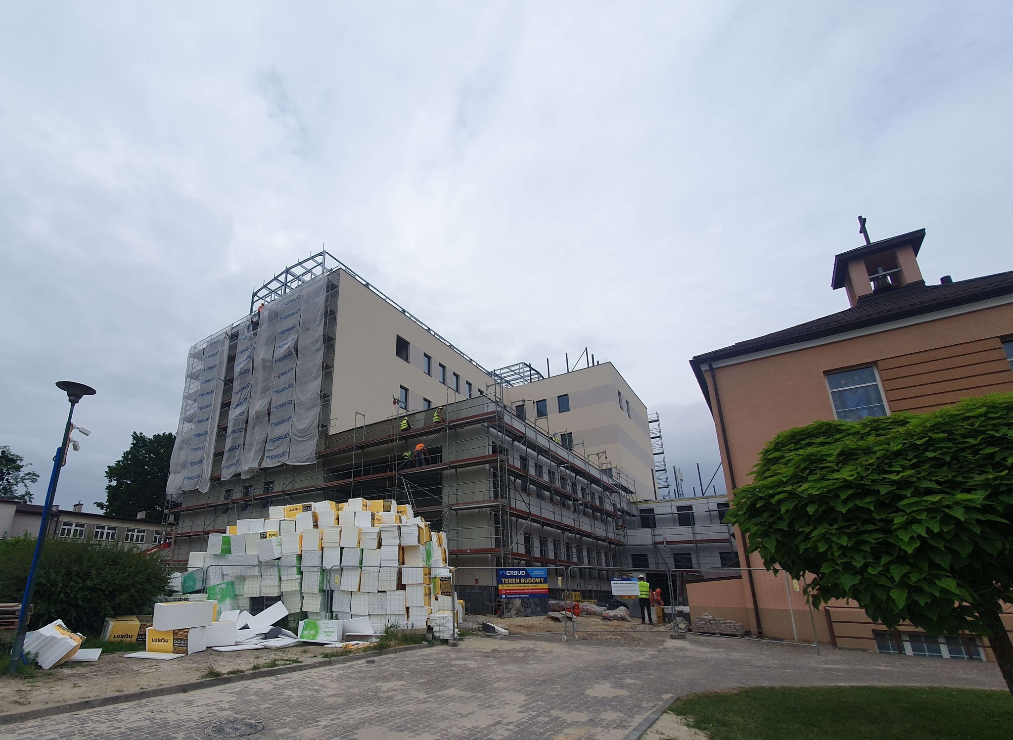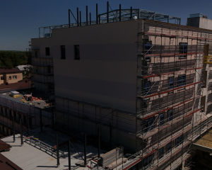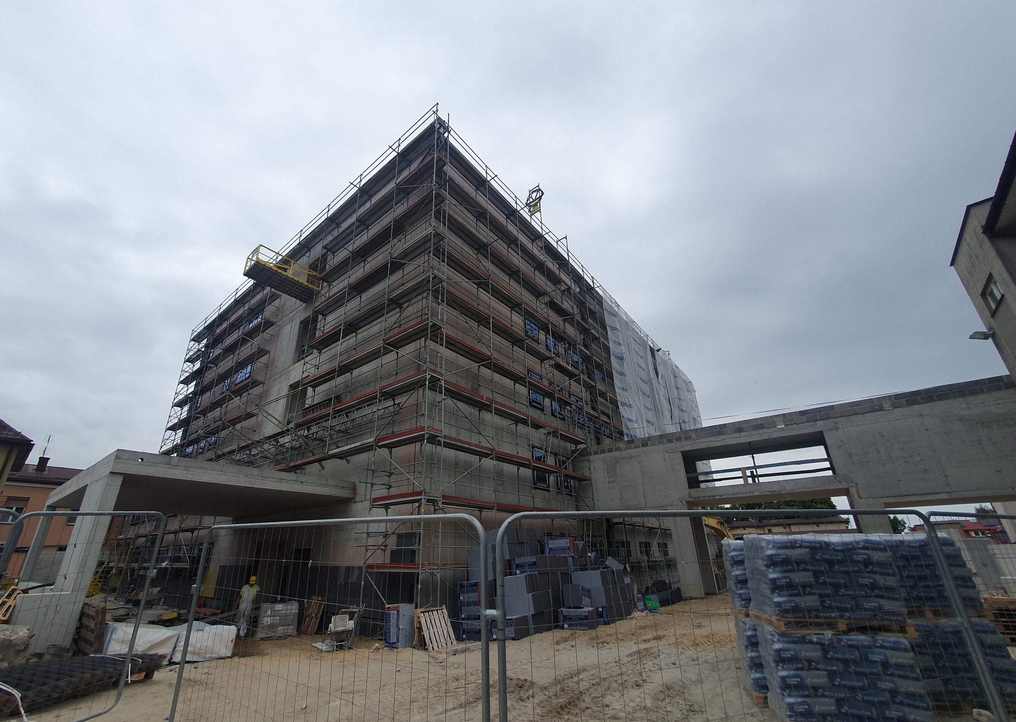 Konstrukcja budynku jest już całkowicie gotowa! Ukończono jej ostatnie kluczowe elementy – łącznik, który zapewni wygodne przejście do istniejącego Oddziału Neurologii i Leczenia Padaczek, oraz estetyczne zadaszenie nad wejściem głównym. Wszystkie okna są już zamontowane, zapewniając odpowiednie doświetlenie wnętrz i izolację. Trwają intensywne pracuje nad elewacją, która nie tylko będzie wizytówką obiektu, ale także zapewni mu trwałość i ochronę. Część fasady od strony północnej już prezentuje swoje jasne, nowoczesne wykończenie.