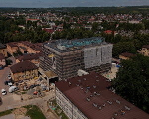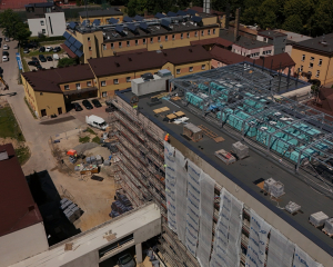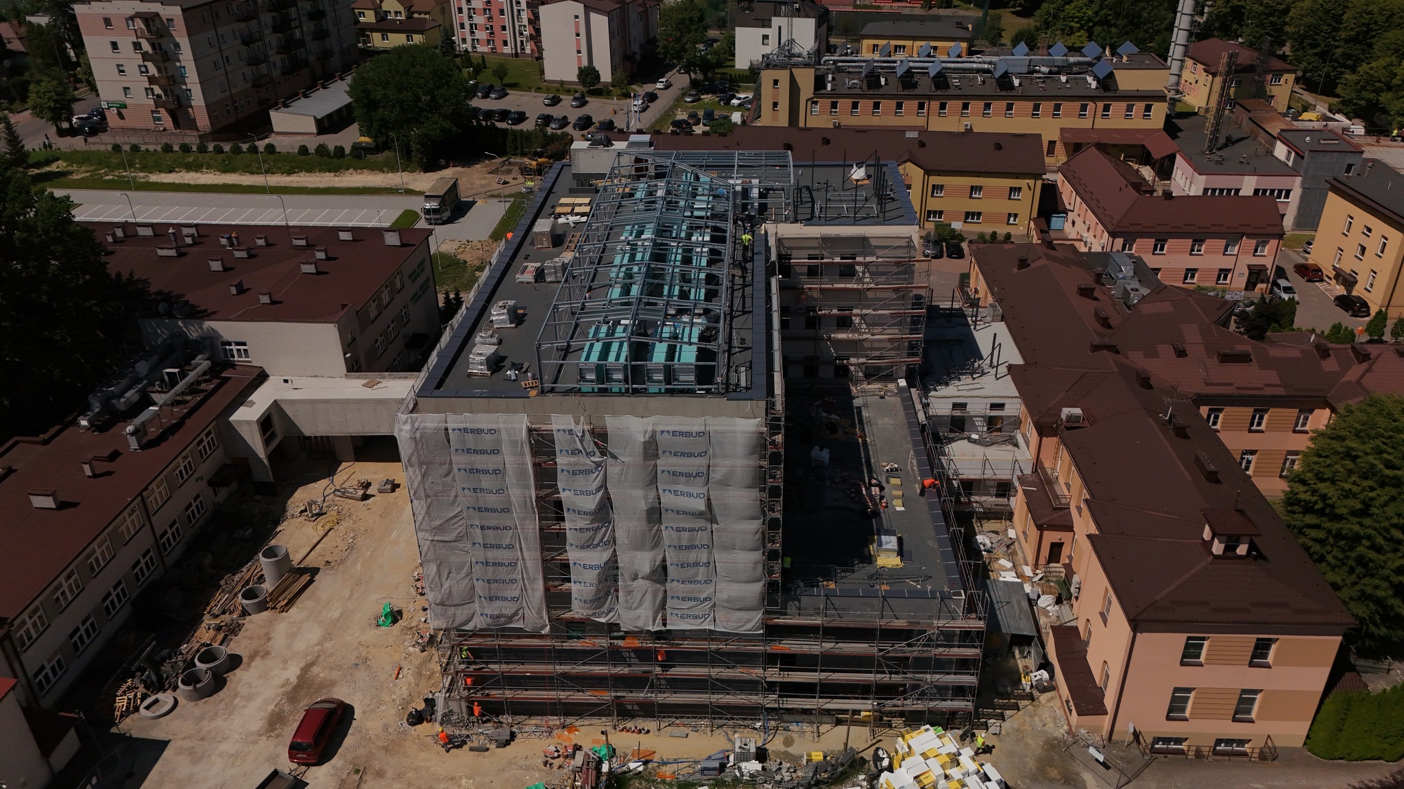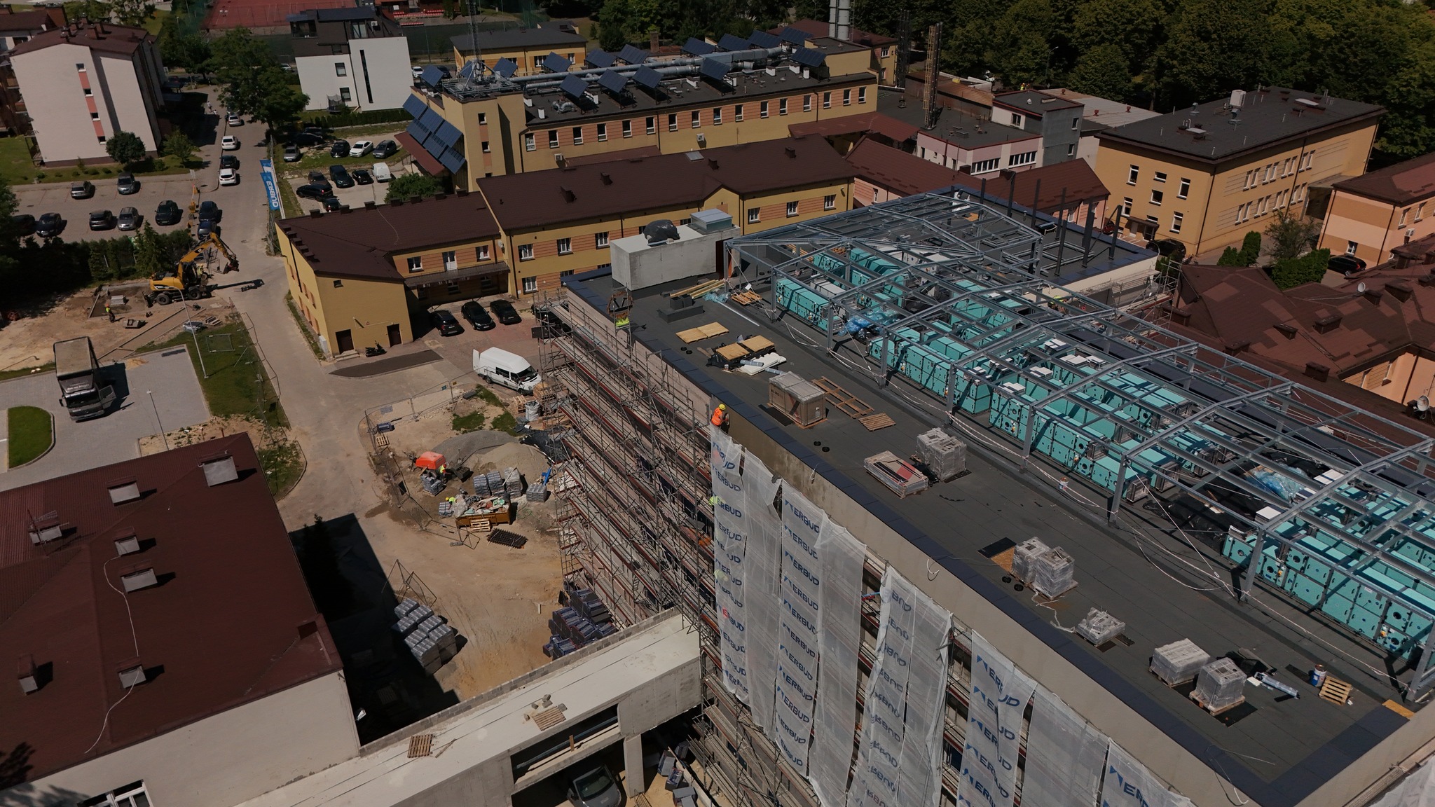 Wnętrza również zyskują swoją funkcjonalność! Wzniesiono już większość ścianek działowych, które wyznaczają przyszłe gabinety, sale i pomieszczenia techniczne. Na sufitach rozprowadzono liczne instalacje: wentylacyjne, elektryczne i wodno-kanalizacyjne – to kluczowe systemy, które zapewnią odpowiednie warunki i komfort użytkowania. W wielu pomieszczeniach trwają już zaawansowane prace wykończeniowe i montaż niezbędnych urządzeń technicznych. Na dachu budynku zamontowano już nowoczesne centrale wentylacyjne – to one będą dbać o stały dopływ świeżego powietrza do wszystkich pomieszczeń!