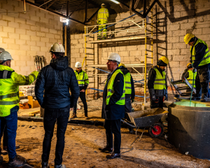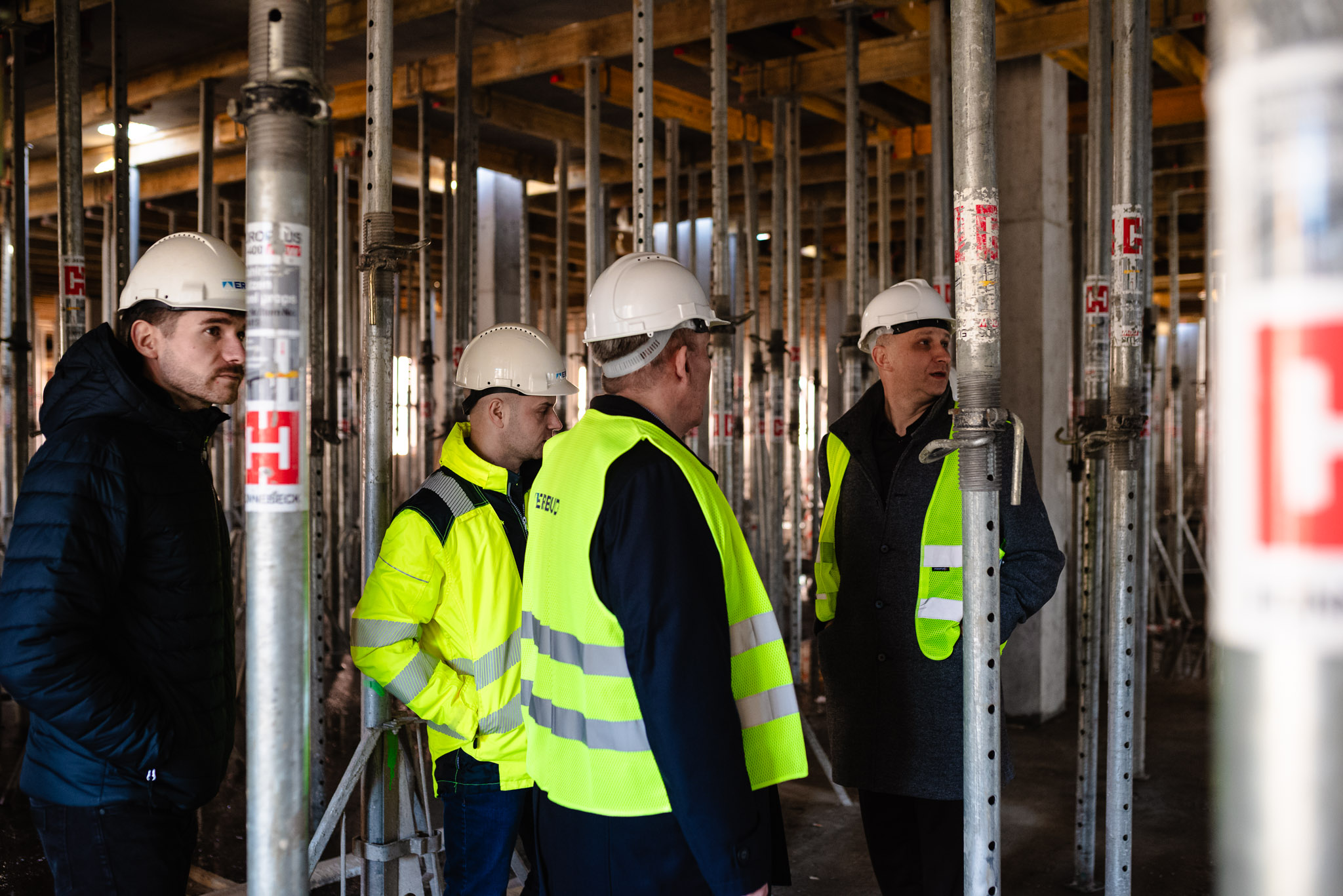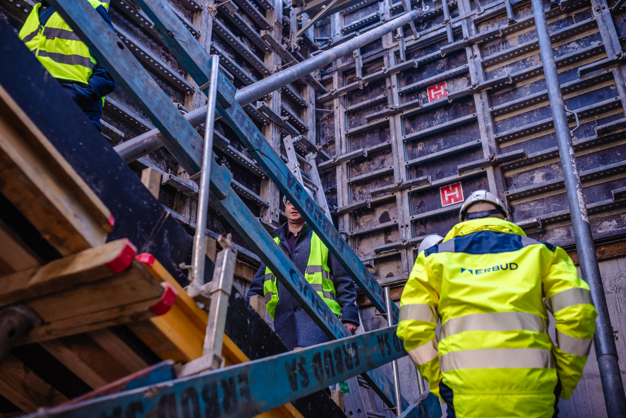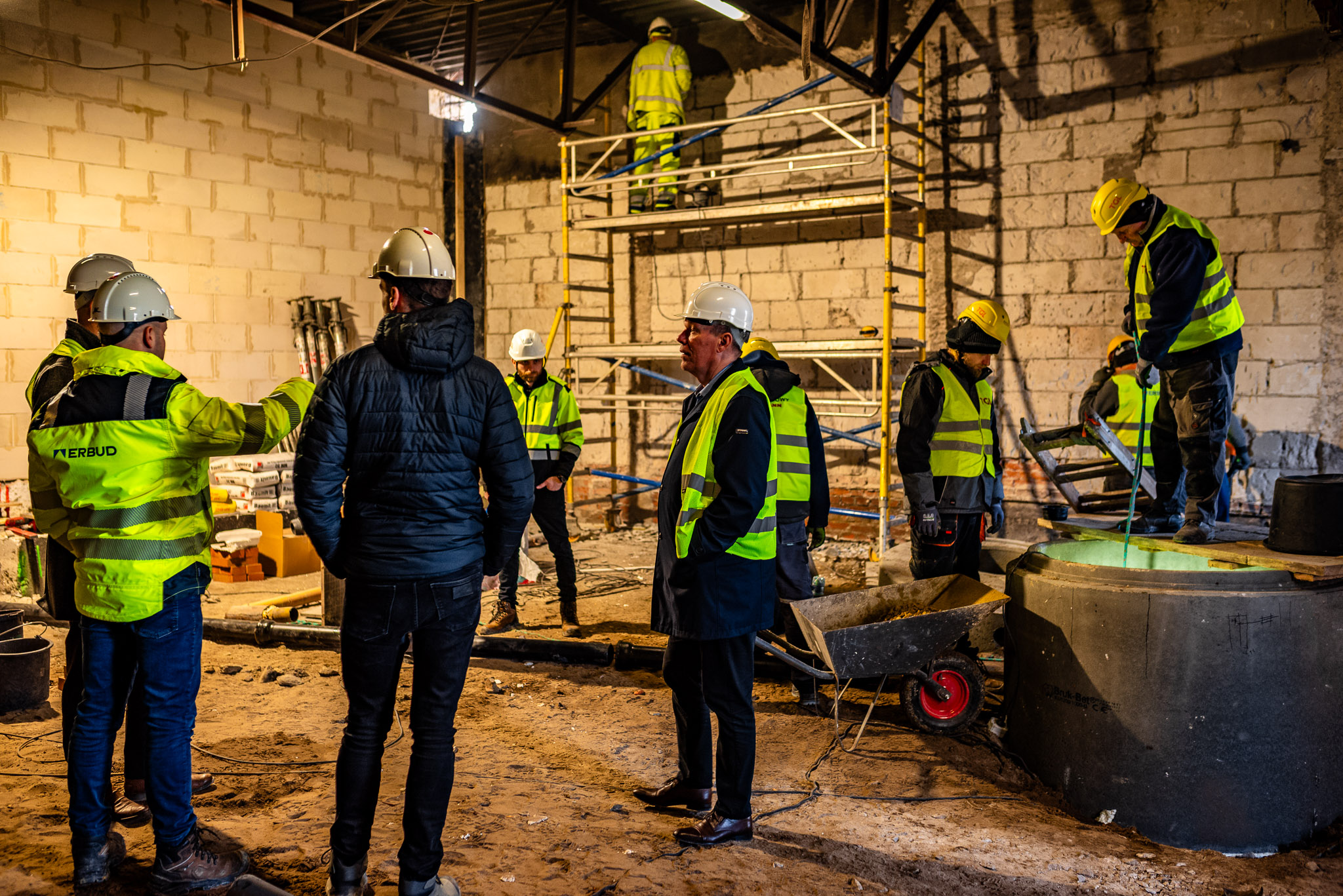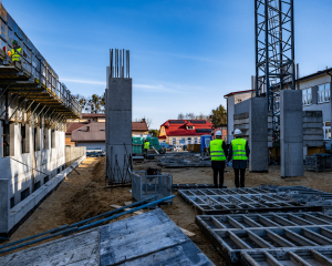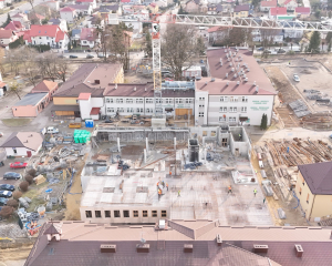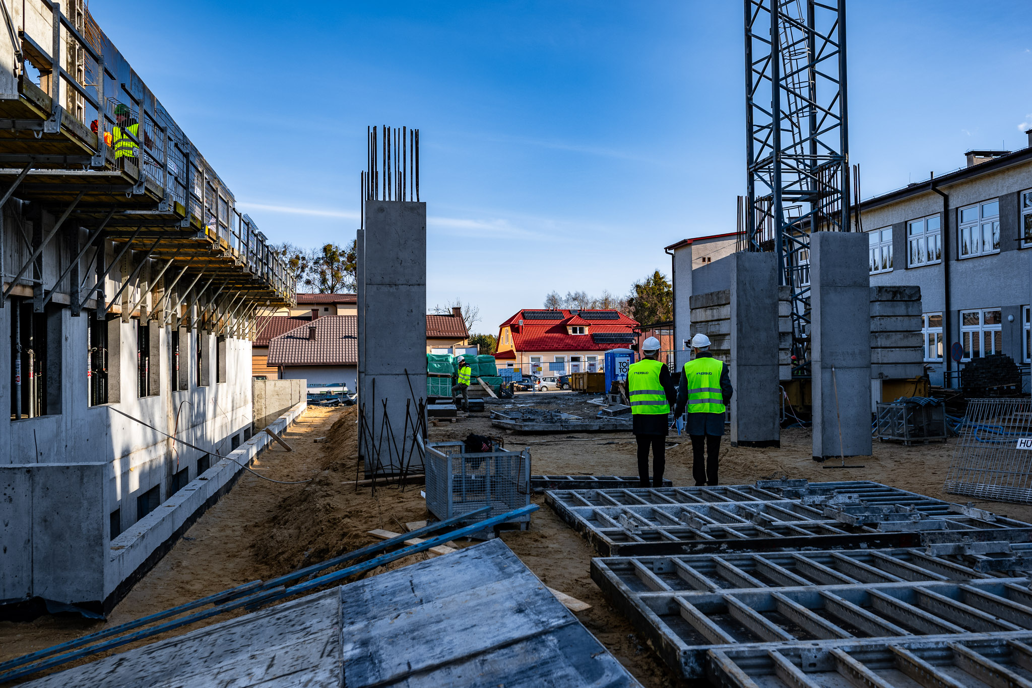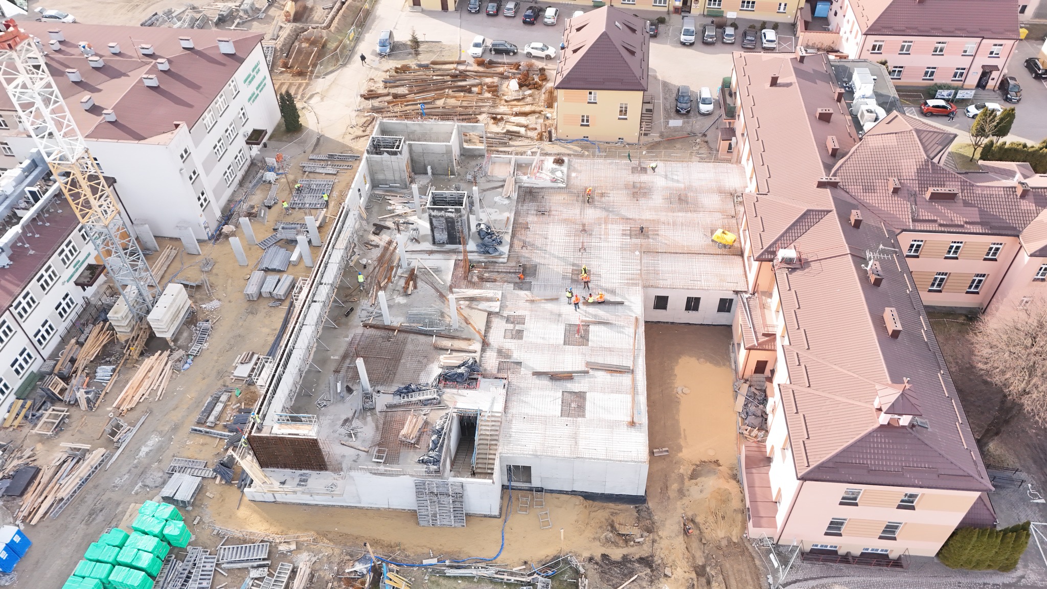 Kontynuowane są również roboty konstrukcyjne w budynku głównym, gdzie powstają kolejne żelbetowe ściany i słupy na piętrze+1. Rozpoczęto też prace murarskie w zakresie ścian działowych w kondygnacji piwnicy. Zakończono wykonywanie zasypek wokół budynku i rozpoczęto montaż rusztowania, co oznacza przygotowania do montażu stolarki okiennej i robót elewacyjnych.