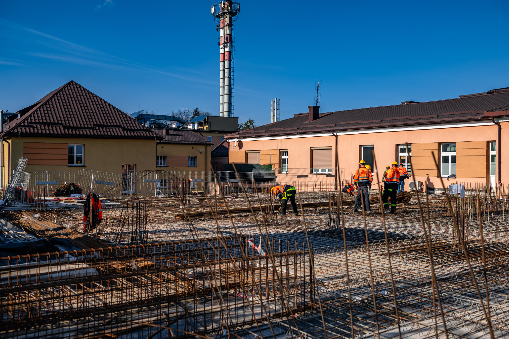 W ostatnim miesiącu prace skoncentrowane były na wykonaniu konstrukcji dwukondygnacyjnego budynku łączącego główny budynek bloku operacyjnego z istniejącym budynkiem Oddziału Chirurgii. W tym czasie zakończono konstrukcje fundamentów, ścian i słupów żelbetowych, a w dniu dzisiejszym zabetonowano strop nad parterem.
