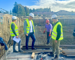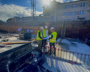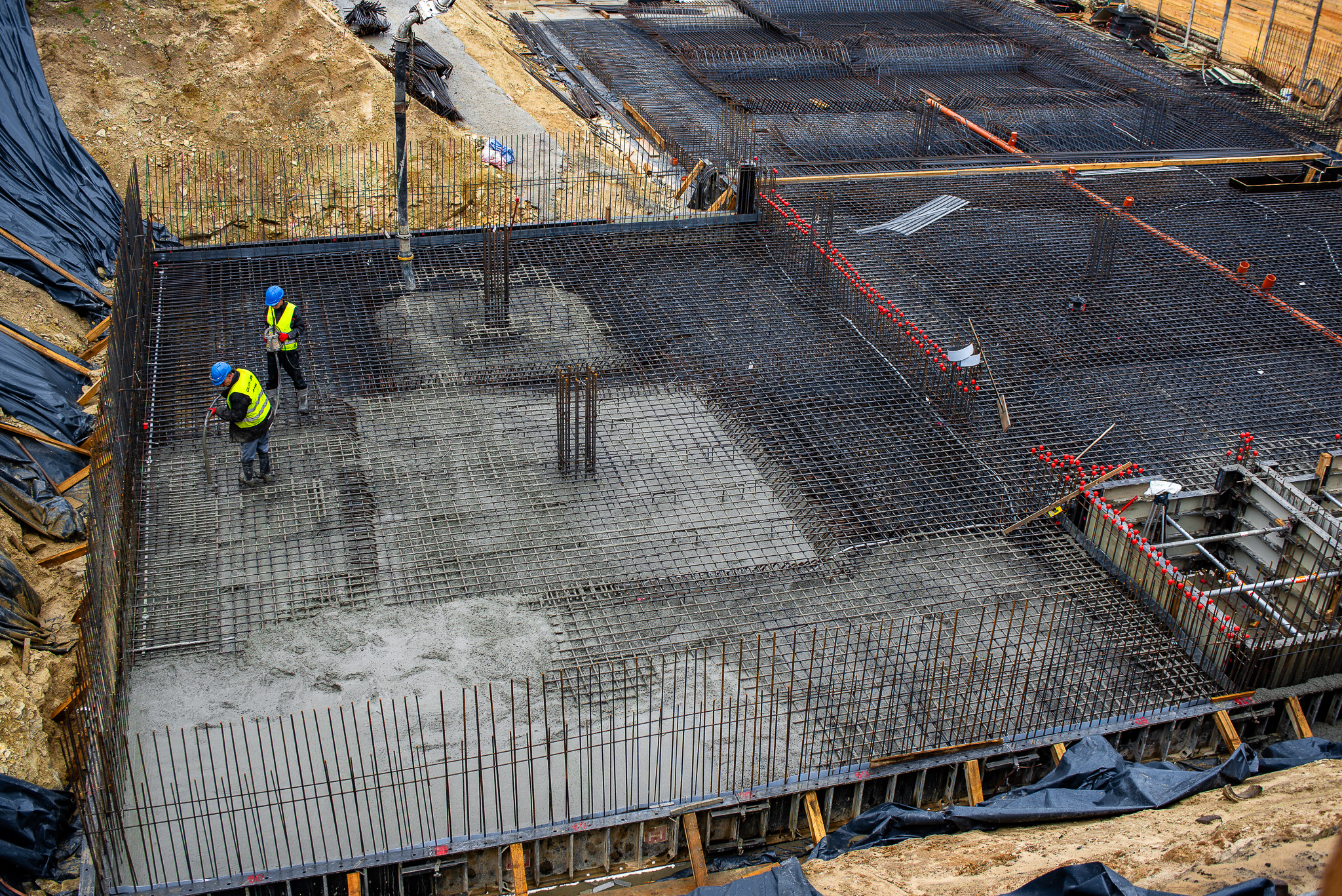 Prace ziemne w obszarze podpiwniczenia budynku również zostały zakończone. Położono beton podkładowy pod całą płytą fundamentową, na którym następnie rozpoczęto montaż zbrojenia oraz wykonano instalację kanalizacyjną i instalację odgromową znajdującą się w płycie fundamentowej. Równocześnie realizowana jest hydroizolacja części podziemnej.