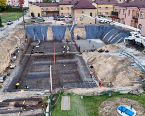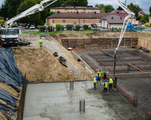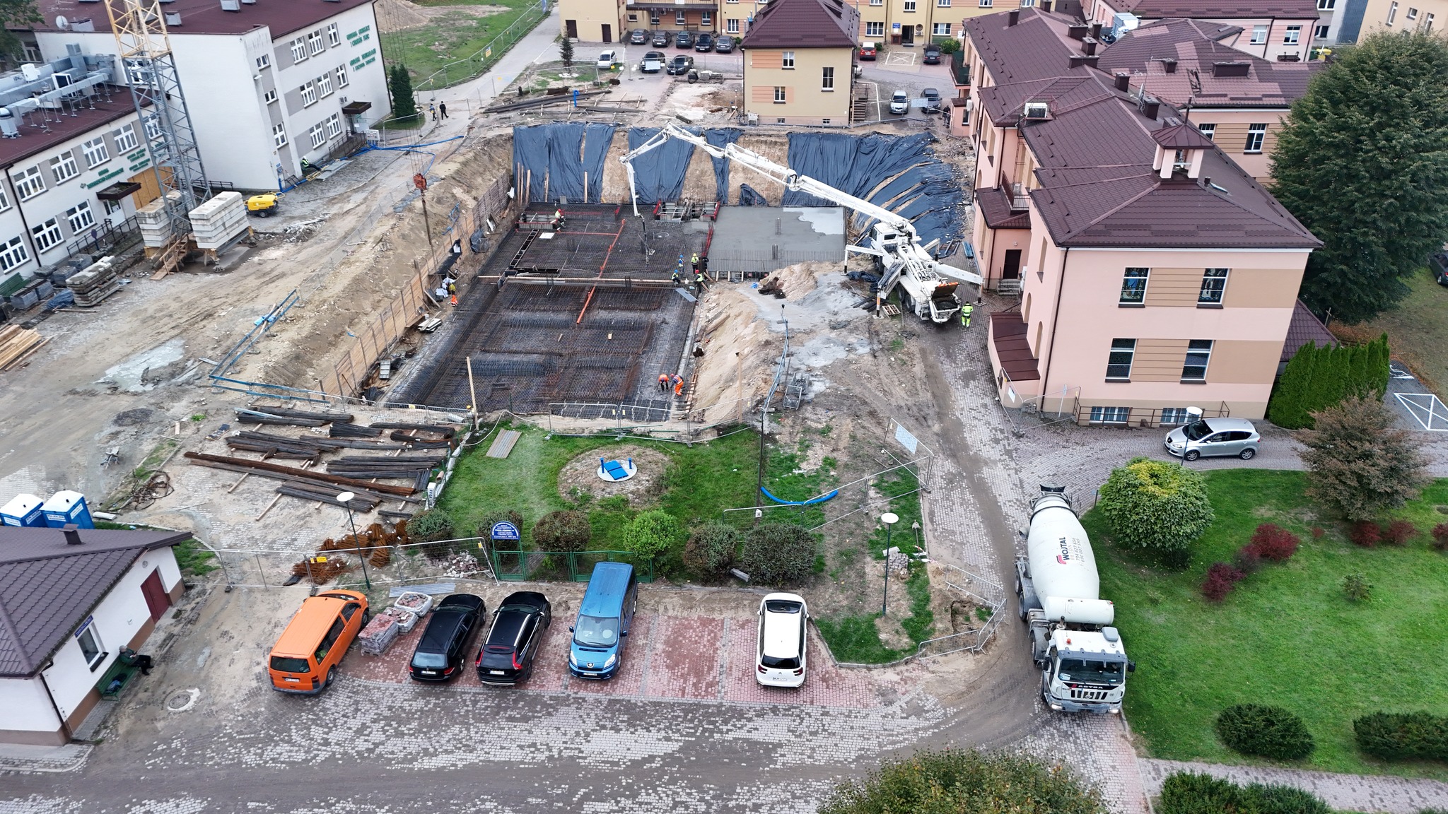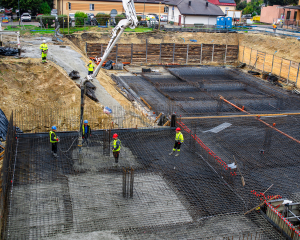 Wykonano już betonowanie około 60% płyty fundamentowej, a obecnie trwają prace nad zakończeniem zbrojenia pozostałej części. Dodatkowo zrealizowano już instalację kanalizacji deszczowej, która będzie odprowadzać wodę z parkingu.