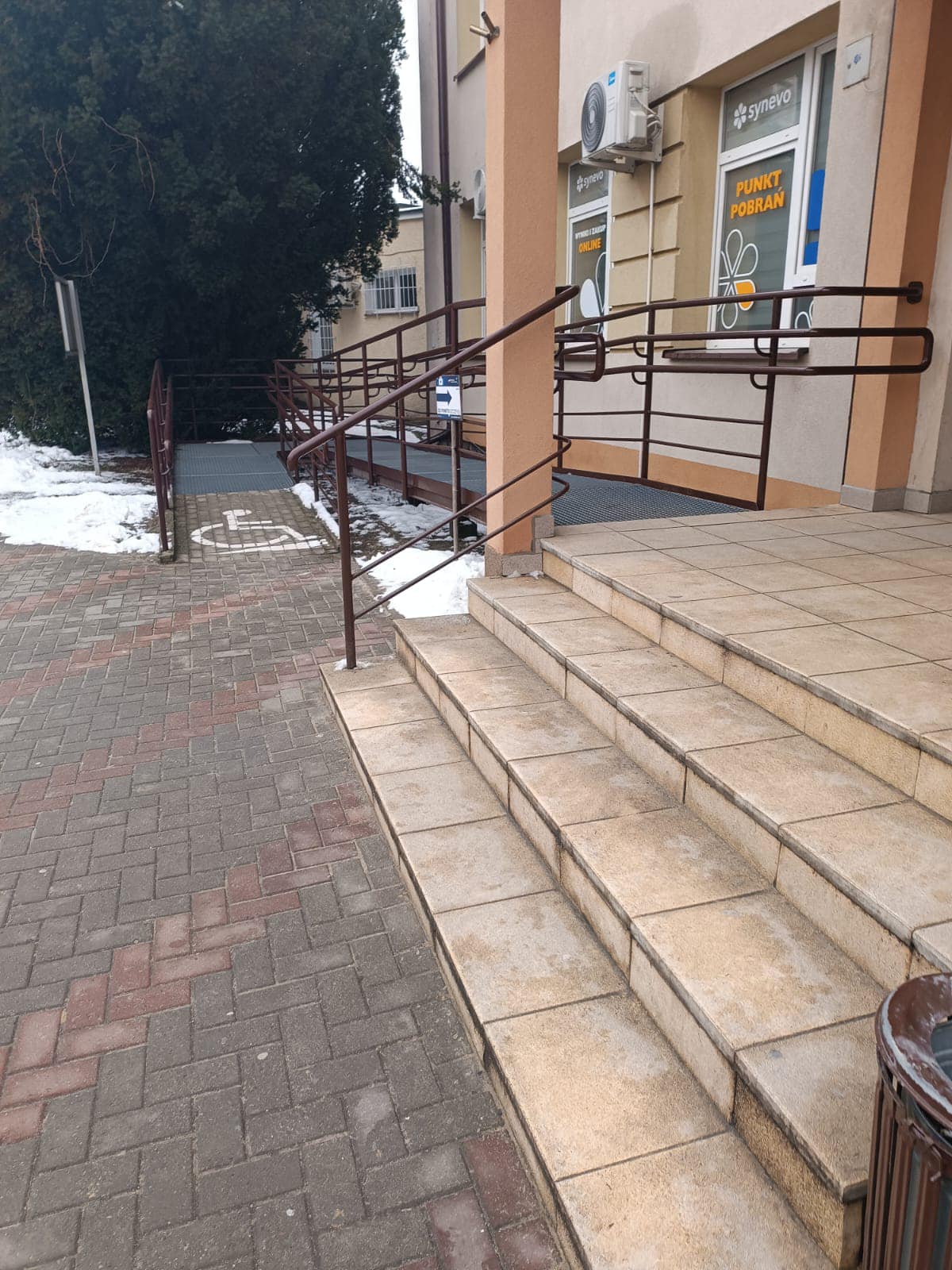 1. Modernizacji wejścia głównego - wymiana nawierzchni schodów zewnętrznych z uwzględnieniem oznakowania dla osób niedowidzących, wymiana podestu na pochylni, nowe barierki na podjeździe i przy schodach zgodne ze standardami dostępności