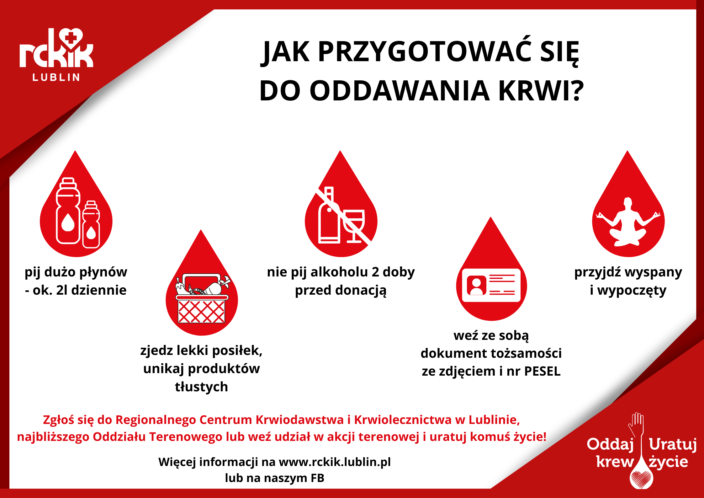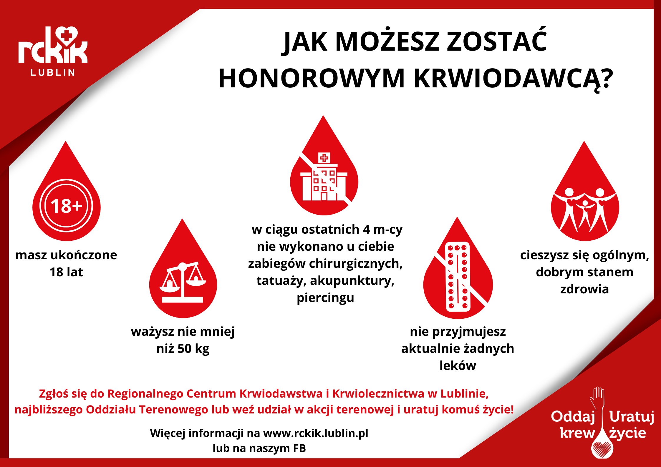 Pamiętajmy, że krew jest lekiem, którego nie da się niczym zastąpić, ani sztucznie wyprodukować – jego jedynym źródłem jest człowiek chcący podzielić się tym niezwykłym darem. Stąd też apelujemy o pomoc w promowaniu idei honorowego krwiodawstwa i wsparcie działań podejmowanych przez RCKiK Lublin w celu dotarcia do jak największej ilości osób mogących podzielić się krwią z potrzebującymi.