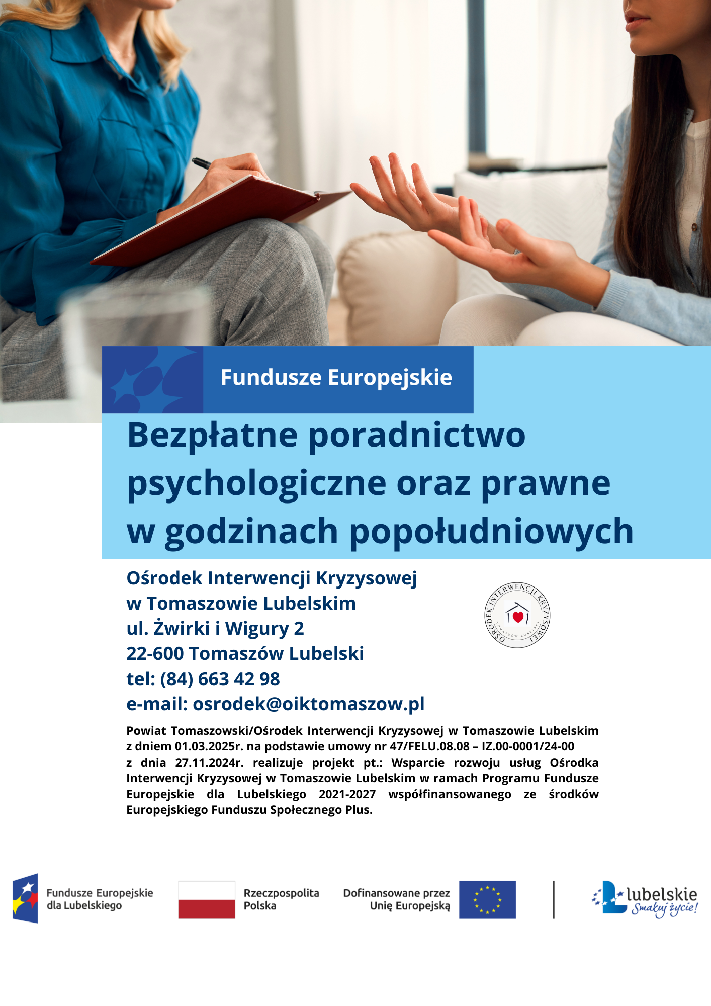 Uprzejmie informujemy, że Ośrodek Interwencji Kryzysowej w Tomaszowie Lubelskim z dniem 01.03.2025r. na podstawie umowy nr 47/FELU.08.08 – IZ.00-0001/24-00 z dnia 27.11.2024r. rozpoczyna realizację projektu pt.: Wsparcie rozwoju usług Ośrodka Interwencji Kryzysowej
