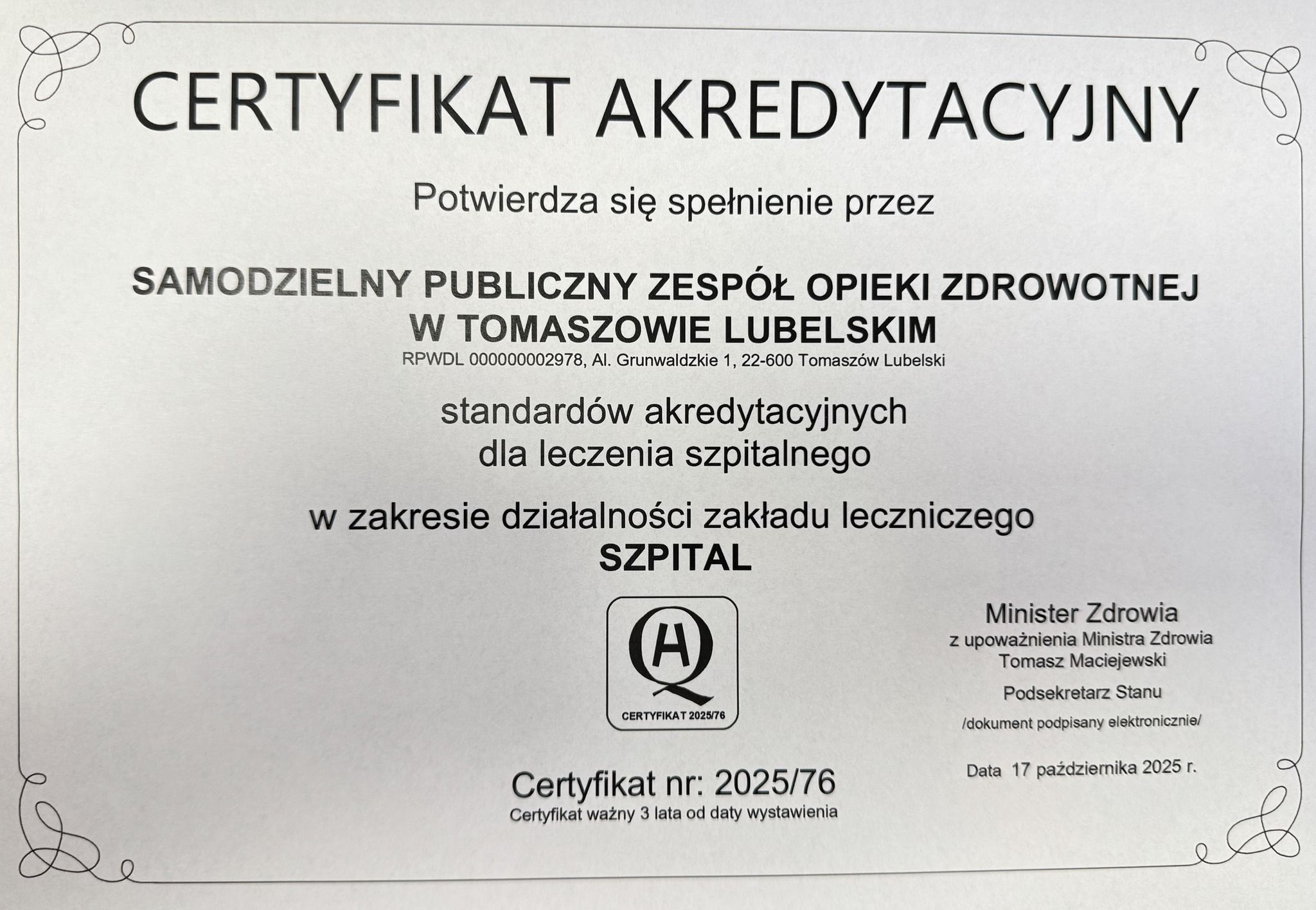 Od kilkunastu lat w Samodzielnym Publicznym Zespole Opieki Zdrowotnej w Tomaszowie Lubelskim, funkcjonuje System Jakości potwierdzony uzyskaniem Certyfikatu Akredytacyjnego oraz Certyfikatu zgodności z Normą ISO 9001:2015.